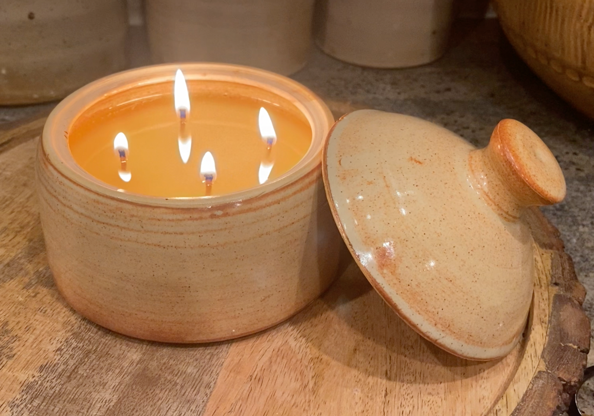 Handcrafted, Wheel-Thrown Container Candle- Large Tan Multi-Colored Vessel and Umbrella Lid- 14oz Luxury, Long-Burning Soy Wax- Phthalate Free Fragrance