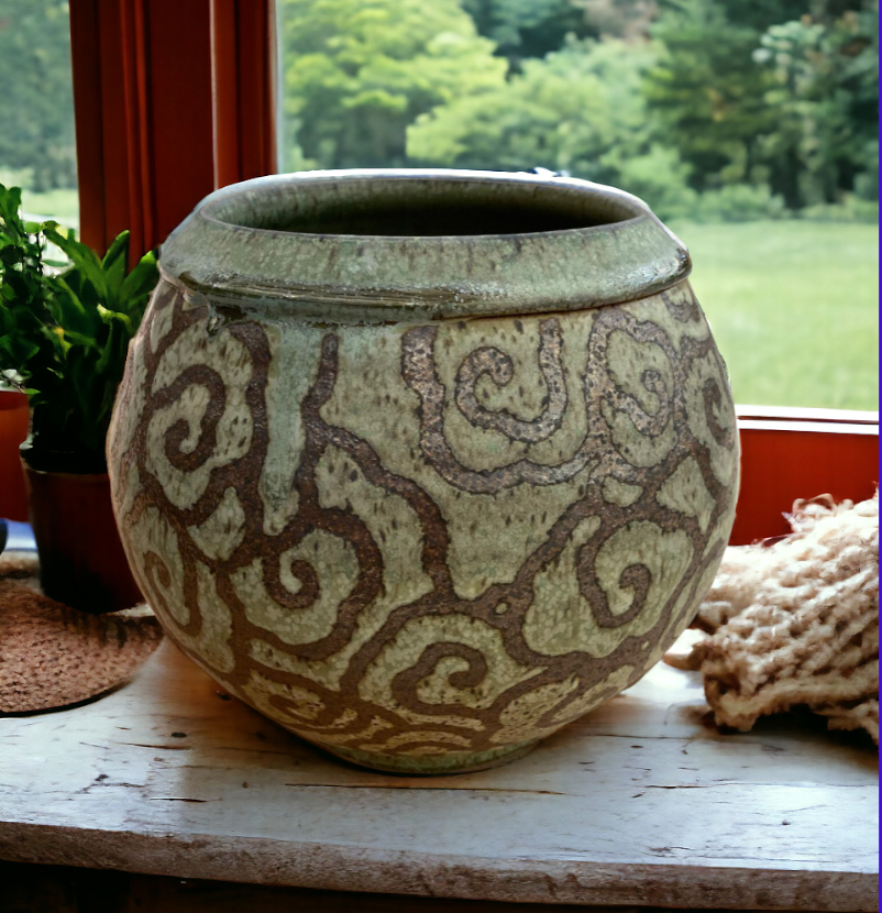 Wheel-Thrown Pottery Art Piece- Multiple Shades of Brown, Cream with a Beautiful Hint of Green, with Dark Streaks and Speckles, Dimensions: 11h"x9.25w"