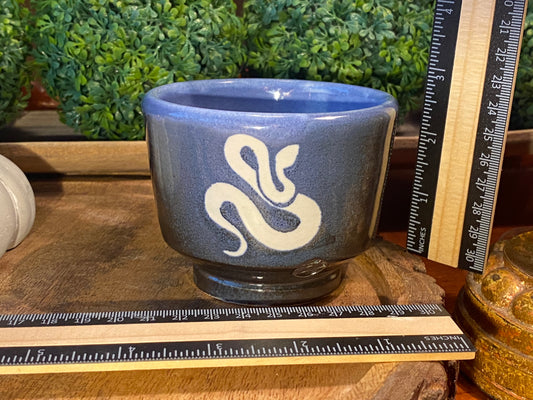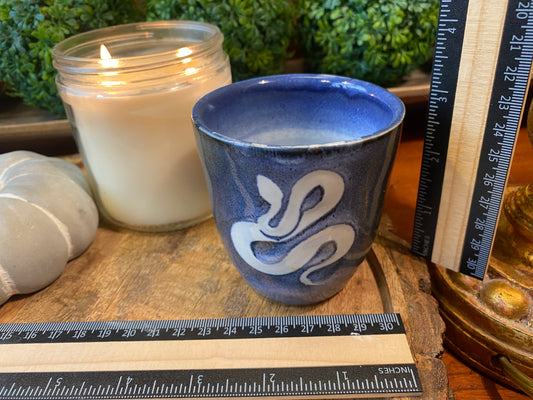 Handcrafted, Wheel-Thrown Container Candle- Small Blue/Black Angled Bottom Vessel with Glazed Snake- 8oz Luxury, Long-Burning Soy Wax- Phthalate Free Fragrance