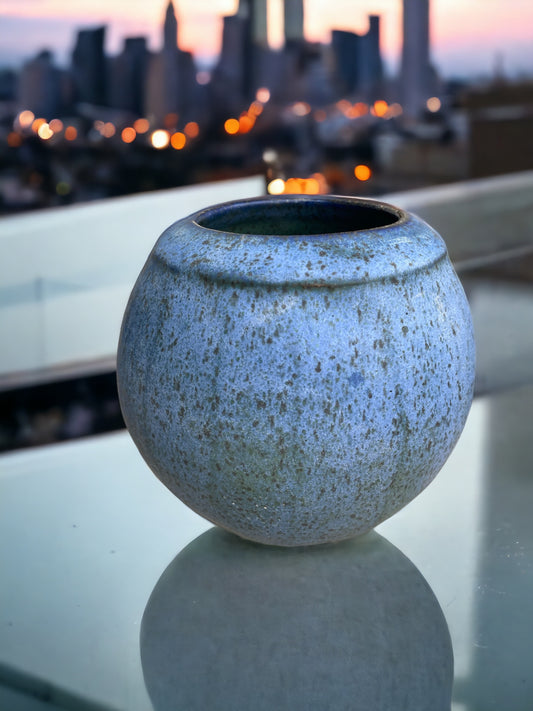 Wheel-Thrown Pottery Art Piece- Channel Cut Orb, Multiple Shades of Blue, with Copper Color and Speckles, Dimensions: 6h"x 6w"