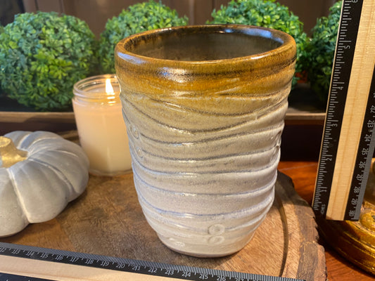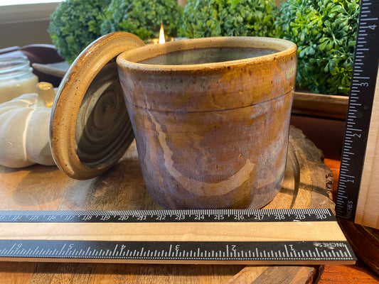 Handcrafted, Wheel-Thrown Container Candle- Large Tan Multi-Colored Vessel and Umbrella Lid- 14oz Luxury, Long-Burning Soy Wax- Phthalate Free Fragrance
